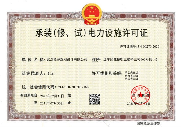 7月31日,武漢能源規(guī)劃設計有限公司申報的承裝(修、試)電力設施許可證書(三級)通過國家能源局華中監(jiān)管局行政審批并取得許可證書。作為新修訂的《承裝(修、試)電力設施許可證管理辦法》7月1日實施后首批獲證企業(yè),公司繼2024年取得電力工程施工總承包貳級資質后,再次斬獲電力工程相關施工資質,為布局電力行業(yè)施工業(yè)務、向設計咨詢施工一體化轉型發(fā)展奠定了基礎。